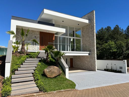 Casa Diamante no condomínio Reserva do Arvoredo!! Obra em Estilo contemporâneo moderno, detalhe da fachada em pedra natural. São três suítes (uma master com closet), sala de estar com lareira canadense, sala de jantar e ampla cozinha americana (espaço social integrados junto à cozinha), porta principal com identificação facial, persianas automatizadas, piscina com spa com aquecimento. Garagem para 3 carros, com espera para tomada para carro elétrico. Espera para som em todos os ambientes. Estuda aceitar imóvel como parte do pagamento.