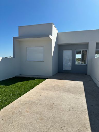 Casa geminada com estilo contemporâneo, com 02 dormitórios, sala e cozinha integradas, churrasqueira, pátio frontal privativo com grama e também possui pátio frente e nos fundos. Detalhes construtivos: Estilo contemporâneo Piso - cerâmica retificado Teto com laje de concreto Aberturas externas em vidro temperado com persiana nos dormitórios Portas internas brancas. Churrasqueira com revestimento interno refratário.