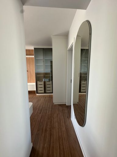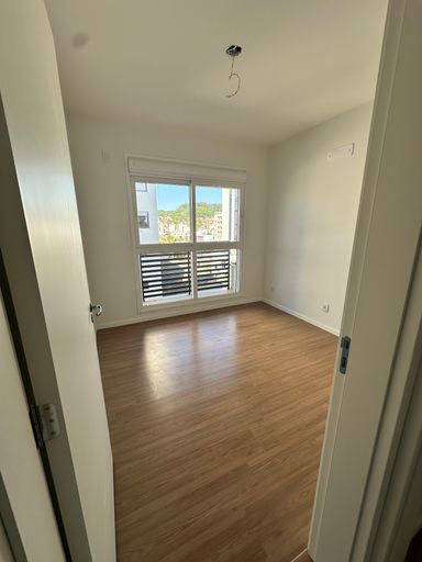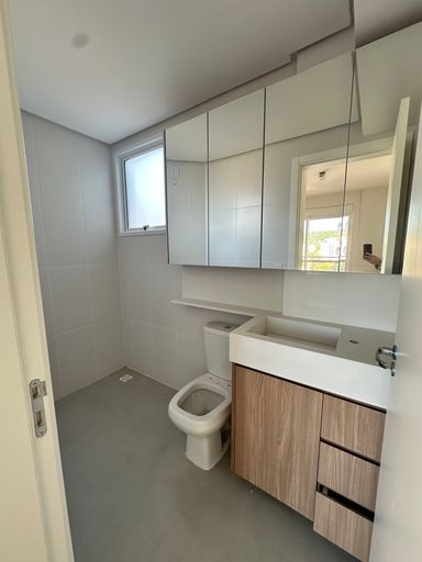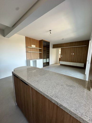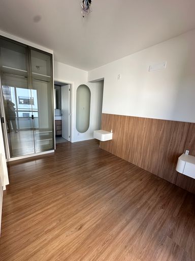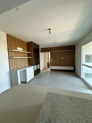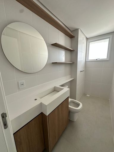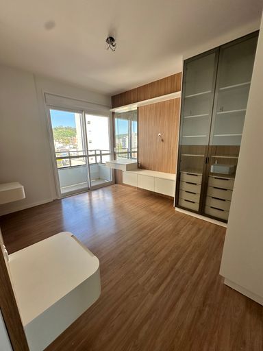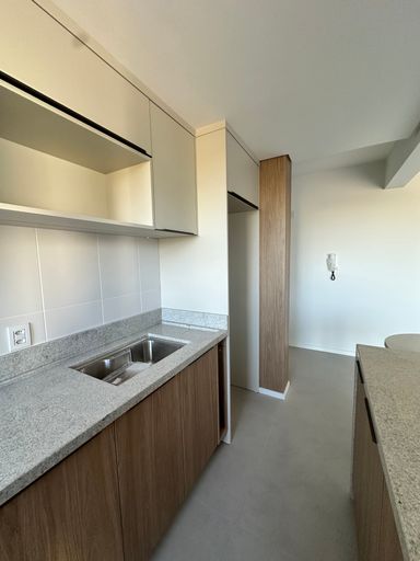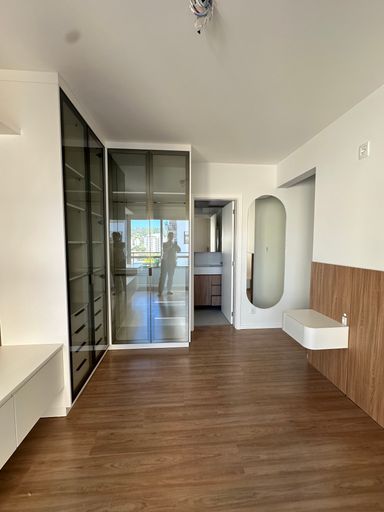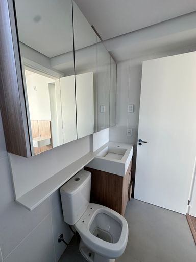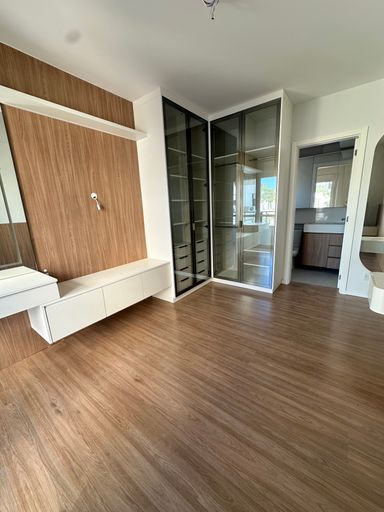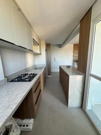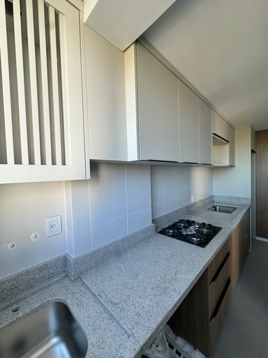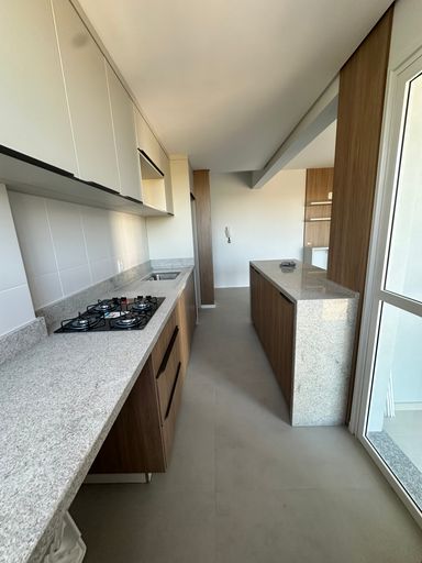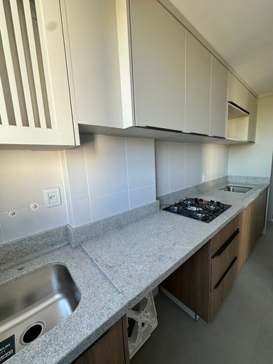 Apartamento novo com móveis planejados na cozinha, área de serviço, hall de entrada, sala, banheiros e suíte.