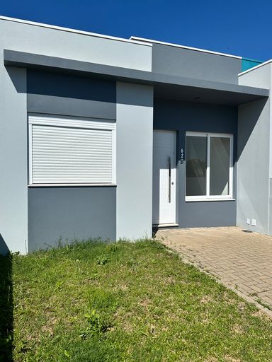 Casa geminada com estilo contemporâneo, com 02 dormitórios, sala e cozinha integradas, churrasqueira, pátio frontal privativo com grama e também possui pátio frente e nos fundos.
