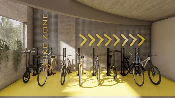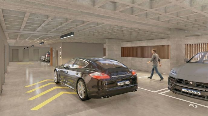 Cada apartamento terá 1 box de garagem com depósito, além da possibilidade de aquisição de vagas extras. O projeto ainda inclui bicicletário para 18 bicicletas, reforçando a praticidade e mobilidade no dia a dia.